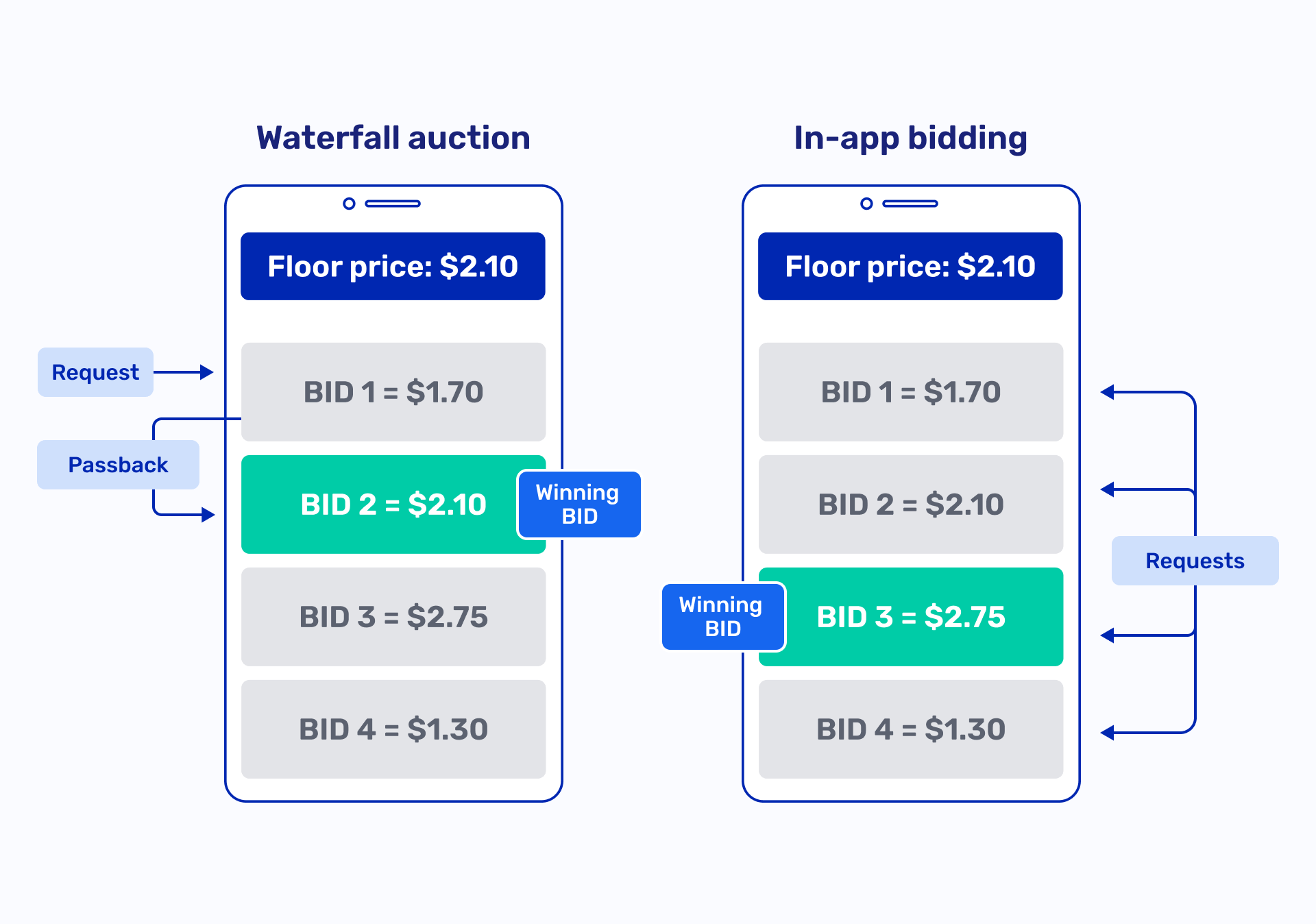 In-app bidding removes this sequential process. A single request is sent, bids are returned and a winner is selected immediately.